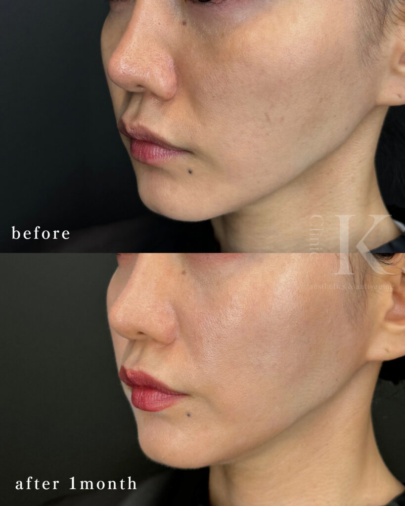 口横〜フェイスラインにかけてのボリュームがしっかりと改善され、ほうれい線も改善しているのがわかります。