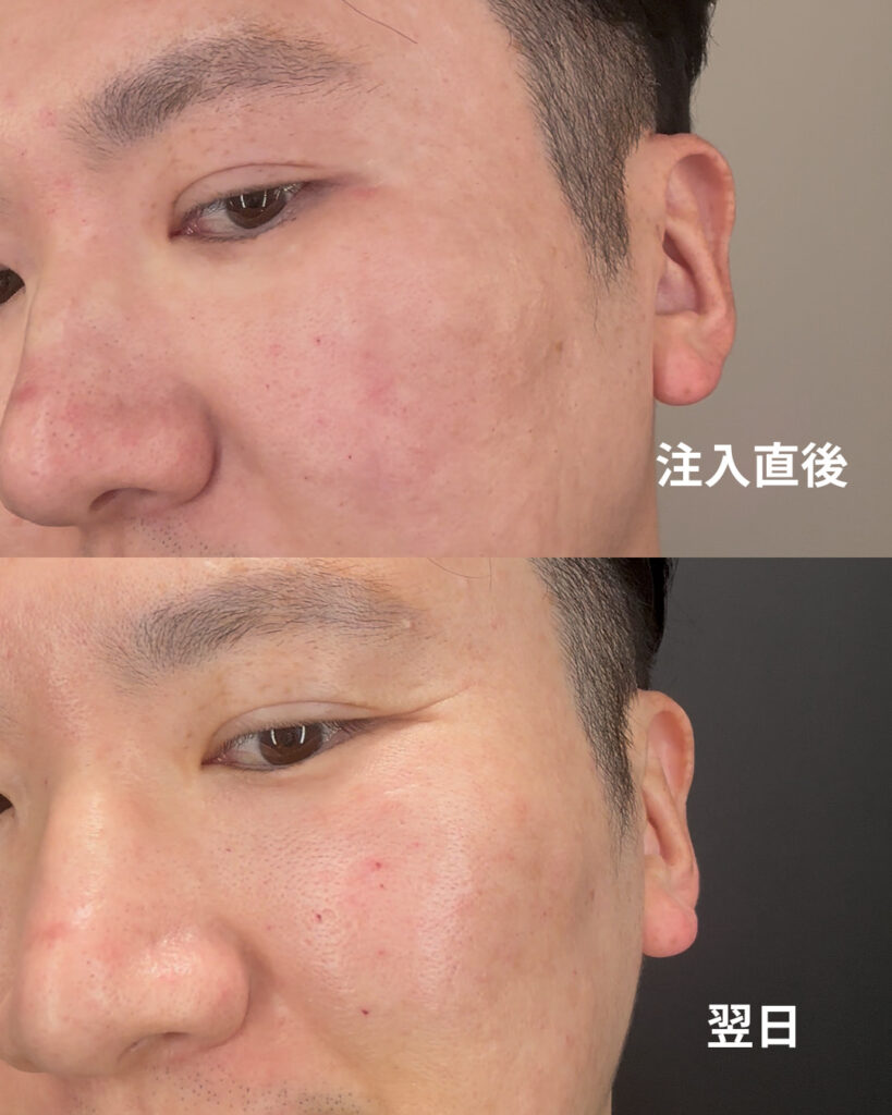 注入直後〜3日程度は赤みや、腫れ、火照り感などを感じる方がいらっしゃいますが、こちらは治療により一時的にお肌が敏感になっていることがほとんどです。