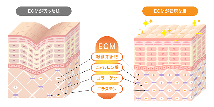 ECM(細胞外マトリックス)は、お肌の中でコラーゲンや⽔分をクッションのように⽀えている⼟台となる成分です。