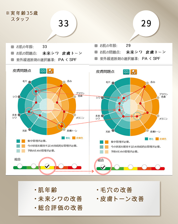 - 全体的な肌質改善 肌診断機の結果からも分かる通り、⽑⽳・未来しわ・⽪膚トーンなどが改善し肌年齢もグッと若くなりました。